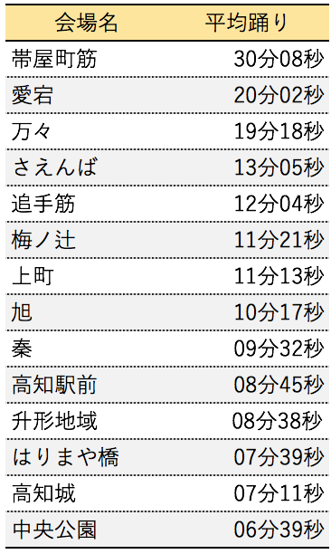 帯屋町筋が他の会場を10分以上離し、堂々の1位!最後の方でちょっとカーブがある所で「ああ!もう終わりだ。やったー!」と思って、その後にゴールがまだまだな事に心(が折れた)を揺さぶられた踊り子さんは多いんじゃないでしょうか?笑