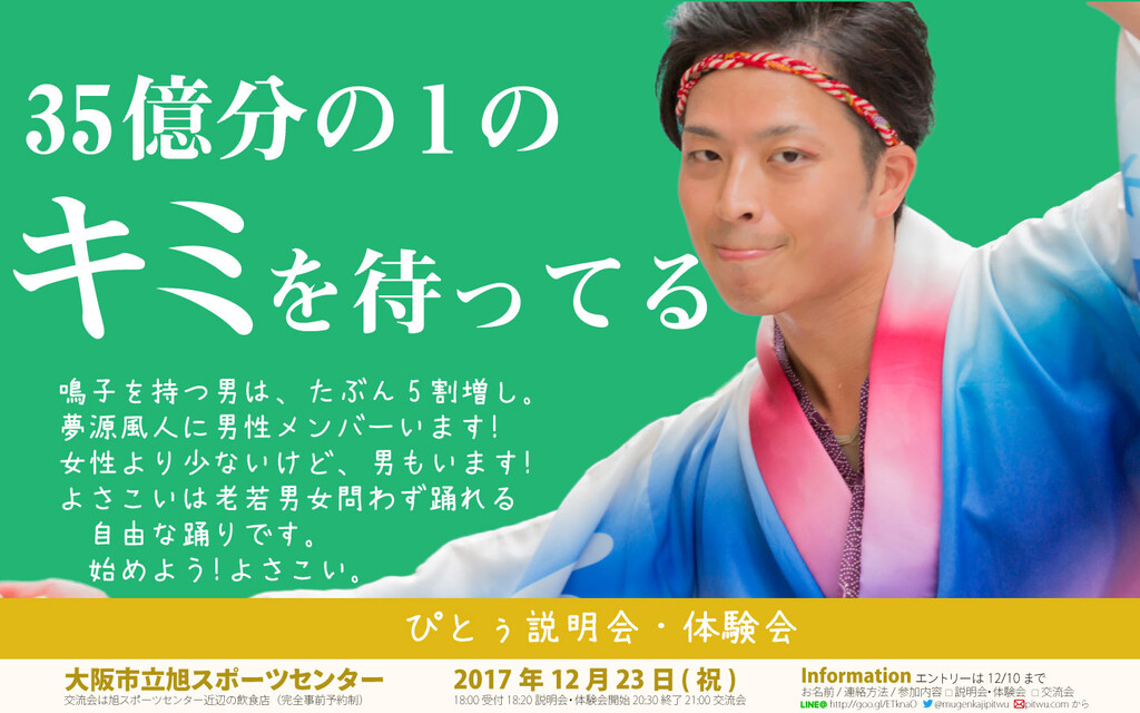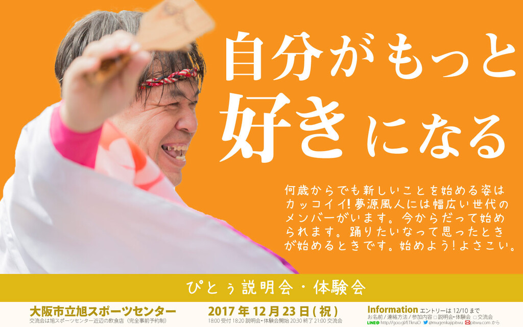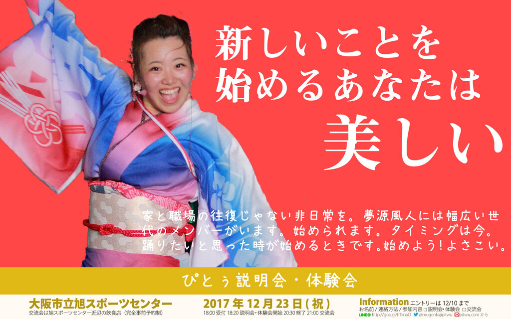 ういちょっと興味ある!!って方を対象にしたイベントです。「よさこい」ってなに?「ぴとぅ」ってどんなチーム?などの疑問にお答えしなががらぴとぅがどんなチームなのか紹介します。 また、体験会では、実際に来年踊る新曲を使って練習します。ぴとぅメンバーも大勢いますし、一緒に体験をする人達はこの先「よさこい」を始める同期になるかもしれません。冬の寒い時期だからこそ新しいことにチャレンジをしてみませんか。