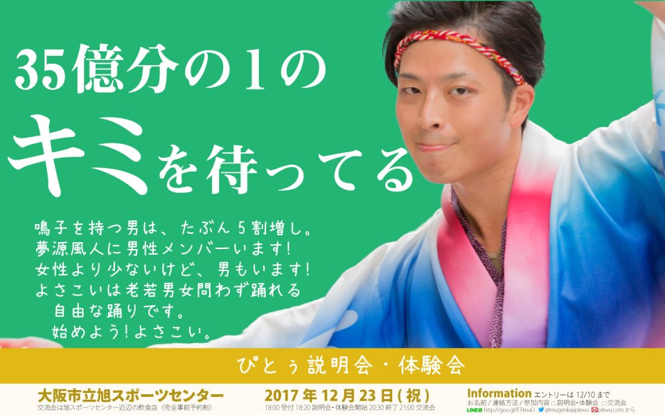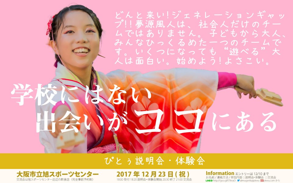むしろ、踊る以外では人見知りって人、割と多いと思います。うちのチームだけ??普段おとなしいメンバーが満面の笑顔で踊って居るのとか本当にうれしいんですよ。第一、僕自身よさこいをはじめて人生が変わりました。それも間違いなくいい方向に。 よさこいをやってみたい人にとって、ぴとぅがいいきっかけになるか、それは今の時点ではわかりませんが、ちょっと頑張ってチャレンジしてみることで新しい側面が開けるかもしれません。そのきっかけがぴとぅだったらすごく幸せ。 なので、「何かをやってみたい」、そういう人によさこいを知ってもらうきっかけとして、ぴとぅ説明会・体験会に遊びに来てくれたらとっても嬉しいです。メンバー一同心待ちにしていますので、ちょっと興味を持った人は是非、遊びに来てくださいませ。もちろん踊った事ある人も歓迎します。新しいぴとぅという世界に触れてみてください! 新しいことはじめましょう。