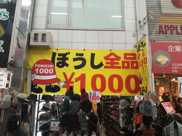 洋服、靴、くつした、カバン、帽子などなどが、このようにポッキリ〇〇円でよく売られています。 商店街全体が激安の殿堂。