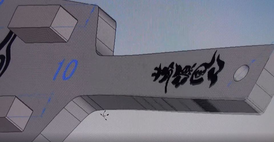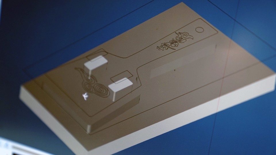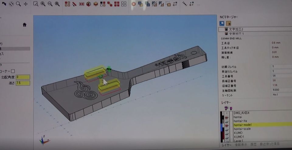 近景。”夢源風人”の漢字のロゴも作り込む。次に3Dデータでシミュレーションを行う。ちゃんと削れるか、削り残しがないか、鳴子として正しく動作するかをコンピューター上で確認する重要な工程だ。