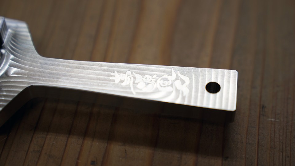 ロゴマークは0.1mmの削り加工。バチの固定にはイモネジ埋め込みを採用していただいた。職人たちの工夫が随所に込められた正に銘品といった趣きを有している。