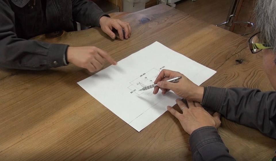 白木鳴子をスキャニング、イラストレーターでベクターデータ化を試みた。そのデータを図面に落とし込んでいく。打ち合わせは細部にまで及ぶ。