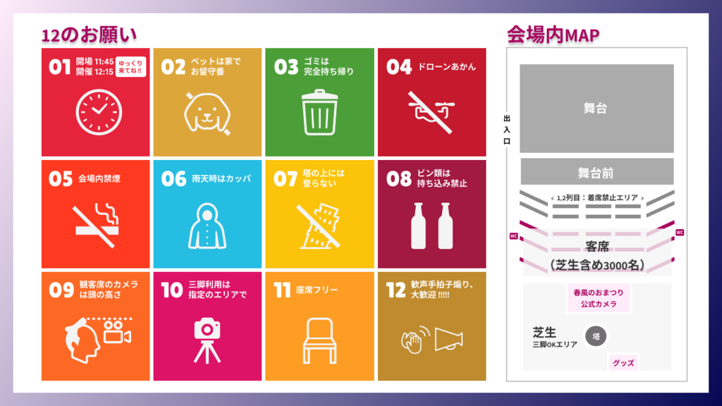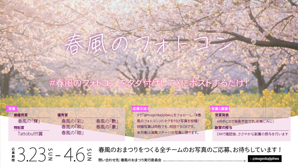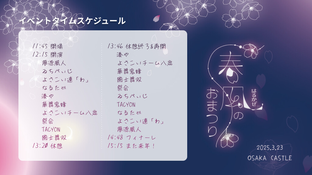 お祭り・イベント 春風のおまつりを3/23に開催します 2025年1月22日 タイムスケジュール2025年3月23日(日):大阪城音楽堂11:45 開場12:15 開演15:15 終了 会場情報 フォトコンやります3/23の「春風のおまつり」でフォトコンを開催します!#春風のフォトコン をタグつけして、全チームさんの素敵な写真を投稿してください!期間は3/23-4/6受賞とささやかな副賞があります🌸みなさんの素敵なお写真をお待ちしています。 その他順次情報追加していきます